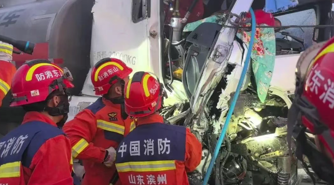 5月15日3時49分,山東濱州市消防救援支隊指揮中心接到報警稱,沾化區(qū)340國道徒駭河大橋紅綠燈附近發(fā)生一起車禍?zhǔn)鹿剩瑑扇吮焕,接警后,沾化?jīng)濟(jì)開發(fā)區(qū)特勤消防救援站立即出動消防救援人員趕赴現(xiàn)場處置。消防救援人員到達(dá)現(xiàn)場后發(fā)現(xiàn),事故現(xiàn)場為一輛油罐車追尾一輛半掛車,油罐車駕駛室嚴(yán)重變形,車頭被擠扁,司機(jī)及押運(yùn)人員分別被變形的操作臺壓住右腳和左腳,無法脫困。 了解情況后,指揮員立即下達(dá)救援命令:警戒組與現(xiàn)場交警部門協(xié)同合作,對事故現(xiàn)場實施交通管制與引導(dǎo);救援組立即展開行動,決定破拆副駕駛室車門率先對押運(yùn)人員實施救援,首先利用無齒鋸對車門鉸鏈進(jìn)行切割,但鉸鏈為鑄鐵材質(zhì),一時難以割斷。 為節(jié)省救援時間,消防救援人員嘗試用拖車對油罐車駕駛室右側(cè)A柱進(jìn)行拖拽牽引,無奈效果不明顯。隨后,消防救援人員再次使用液壓破拆工具組對副駕駛室車門進(jìn)行破拆,車門被成功打開后,借助液壓擴(kuò)張鉗不斷擴(kuò)張押運(yùn)人員左腳的被卡位置,增大救援空間,經(jīng)過1個多小時的緊張救援,押運(yùn)人員被成功救出,交由現(xiàn)場等候的120醫(yī)護(hù)人員,送往醫(yī)院接受治療,同時,被困司機(jī)的右腳也拔了出來,自行由駕駛室車門脫困,現(xiàn)場交通恢復(fù)正常通行。事后,從被困司機(jī)處了解到,事發(fā)時霧太大,加之前車尾燈損壞不亮,導(dǎo)致在紅綠燈路口剎車不及造成追尾。