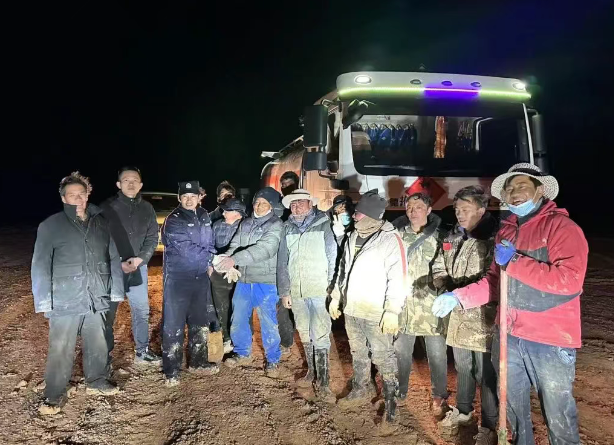 5月20日晚17:00時許,西藏雙湖縣公安局措折羌瑪鄉(xiāng)派出所接到緊急報警:一輛前往本鄉(xiāng)鎮(zhèn)送油的油罐車,在行駛至3村附近時,因道路泥濘,車輛不慎駛?cè)肽酀糁斜焕,急需救援。接警后,派出所立刻響應,迅速集結(jié)救援力量、攜帶專業(yè)救援設備,火速趕赴現(xiàn)場。到達現(xiàn)場后,民警發(fā)現(xiàn)滿載汽油的油罐車因自身重量大,深陷泥濘,普通車輛難以實施救援。民警隨即從2村和3村,緊急協(xié)調(diào)大貨車前來支援。 考慮到油罐車過重,直接拖拽存在安全隱患,民警便制定“減重緩拖”方案,調(diào)配皮卡車,裝載油桶,將油罐車內(nèi)汽油逐步抽取轉(zhuǎn)運,最終抽出24桶散裝汽油;同時,組織人員在附近采集沙子,裝填130余袋塑料袋,鋪設在救援路線上,增強車輛與地面的摩擦力,并將大貨車與被困油罐車通過鋼絲繩相連進行拖拽。最終,在民警與全體救援人員的緊密配合下,經(jīng)過長達12小時的連續(xù)奮戰(zhàn),成功將深陷泥濘的油罐貨車解救出來。