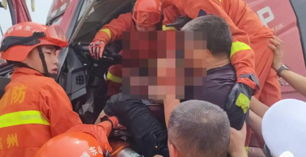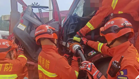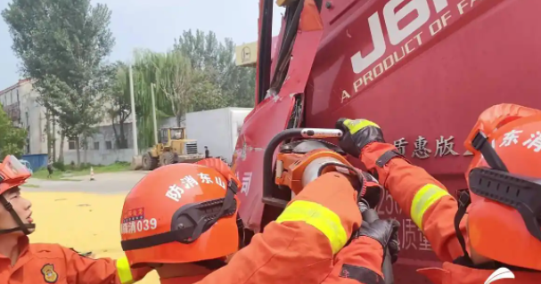 8月7日13時32分,在濱州鄒平市魏橋鎮(zhèn)金橋大道發(fā)生一起油罐車相撞事故,情況緊急,急需救援。消防救援人員到達現(xiàn)場后看到,事故發(fā)生在一個十字路口,由南向北行駛的油罐車撞上由西向東正常行駛的半掛車車廂,導致半掛車車廂側(cè)翻,車廂內(nèi)玉米傾瀉一地,油罐車駕駛室嚴重變形,駕駛員頭部鮮血淋漓,雙腿被卡在駕駛室內(nèi)無法脫困。 消防救援人員首先利用液壓破拆工具組對駕駛室車門進行破拆,仔細觀察駕駛員雙腿被卡情況,并詢問是否有其他受傷部位。隨即消防救援人員利用液壓擴張器對變形駕駛室進行擴張,增大被困駕駛員腿部救援空間,同時車內(nèi)消防救援人員扶住駕駛員身體,并不斷安慰被困人員情緒。 經(jīng)過10分鐘的緊張救援,消防救援人員將司機被卡的雙腿成功抽出,抬上救護車送往醫(yī)院。