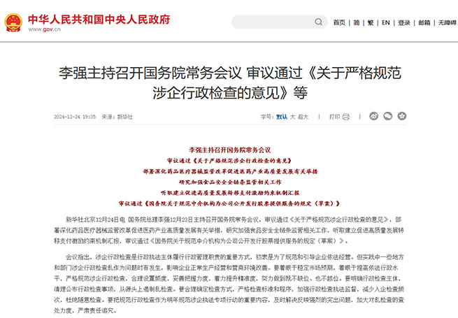 國務(wù)院總理李強(qiáng)12月23日主持召開國務(wù)院常務(wù)會議,審議通過《關(guān)于嚴(yán)格規(guī)范涉企行政檢查的意見》,部署深化藥品醫(yī)療器械監(jiān)管改革促進(jìn)醫(yī)藥產(chǎn)業(yè)高質(zhì)量發(fā)展有關(guān)舉措,研究加強(qiáng)食品安全全鏈條監(jiān)管相關(guān)工作,聽取建立促進(jìn)高質(zhì)量發(fā)展轉(zhuǎn)移支付激勵約束機(jī)制匯報,審議通過《國務(wù)院關(guān)于規(guī)范中介機(jī)構(gòu)為公司公開...