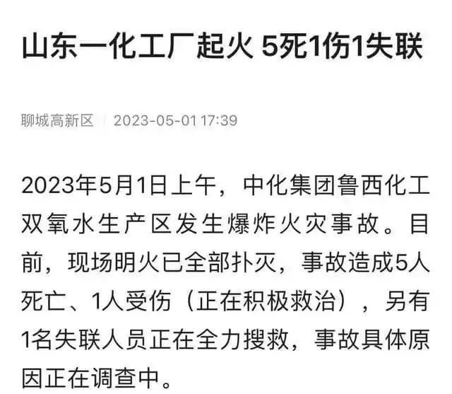5月1日上午8點(diǎn)30分左右,有聊城市茌平區(qū)和東阿縣的網(wǎng)友忽然聽到一聲巨響,震得門窗亂晃。隨后,網(wǎng)上傳出多段疑似魯西化工區(qū)域濃煙滾滾的視頻。 在當(dāng)?shù)匾粋(gè)區(qū)域頭條群,有很多購買了魯西化工股票的網(wǎng)友有點(diǎn)恐慌,交流中可以看出希望這是條假消息。 據(jù)當(dāng)?shù)匾晃淮迕穹Q,聽到響聲時(shí)他在離工業(yè)園區(qū)7公里外的東阿縣城,12點(diǎn)左右,他到現(xiàn)場(chǎng)時(shí)看到火已經(jīng)滅掉,濃煙也已止住,現(xiàn)場(chǎng)有消防車作業(yè),并有多輛救護(hù)車出入。 下午5點(diǎn)39分,據(jù)魯西化工所在地聊城市高新區(qū)官方發(fā)布,中化集團(tuán)魯西化工雙氧水生產(chǎn)區(qū)發(fā)生的爆炸火災(zāi)事故,已經(jīng)造成了5人死亡、1人受傷,另有1名失聯(lián)人員正在全力搜救。 有網(wǎng)友轉(zhuǎn)發(fā)到頭條群的山東應(yīng)急管理發(fā)布的一篇微博顯示,4月29日,聊城市應(yīng)急局局長曾帶隊(duì)到魯西化工督導(dǎo)檢查“五一”假期期間安全生產(chǎn)工作,強(qiáng)調(diào)生產(chǎn)經(jīng)營單位落實(shí)安全防范措施,在前期工作的基礎(chǔ)上對(duì)當(dāng)前安全生產(chǎn)工作再部署、再落實(shí)、再推進(jìn),嚴(yán)防各類事故發(fā)生。 事故警示信息 2023年5月1日8時(shí)36分許,山東聊城魯西化工雙氧水新材料科技有限公司1號(hào)雙氧水裝置發(fā)生爆炸,已造成重大人員傷亡。事故原因初步分析為,雙氧水裝置工作液配置釜用于回收工作液時(shí),吸入大量70%濃度雙氧水,釜內(nèi)可能存在雜質(zhì)造成雙氧水劇烈分解,引發(fā)配置釜超壓爆炸,造成現(xiàn)場(chǎng)人員傷亡,并波及相鄰企業(yè)辛醇儲(chǔ)罐及部分管線泄漏燃燒,詳細(xì)原因正在調(diào)查中。 各地區(qū)、有關(guān)企業(yè)要深刻吸取事故教訓(xùn),舉一反三,迅速落實(shí)重大隱患排查治理專項(xiàng)行動(dòng)部署,切實(shí)強(qiáng)化重大風(fēng)險(xiǎn)管控,堅(jiān)決防范遏制重特大事故。一是聚焦雙氧水工作液配置釜、氫化塔、氧化塔等重點(diǎn)部位和加氫,過氧化,工作液回收等事故易發(fā)環(huán)節(jié),強(qiáng)化隱患排查治理,落實(shí)風(fēng)險(xiǎn)管控措施。二是嚴(yán)格檢維修管理,節(jié)日期間原則上不得開展動(dòng)火等特殊作業(yè),確需開展的要提級(jí)管理并嚴(yán)格落實(shí)GB30871相關(guān)要求。三是嚴(yán)格限制裝置區(qū)人員數(shù)量,特別是存在爆炸風(fēng)險(xiǎn)的化工裝置區(qū)嚴(yán)禁人員聚集扎堆。 地方各級(jí)應(yīng)急部門要主動(dòng)研判本地區(qū);钒踩L(fēng)險(xiǎn),全面摸排、監(jiān)督落實(shí)安全措施;充分利用風(fēng)險(xiǎn)監(jiān)測(cè)預(yù)警系統(tǒng)在線巡查、明查暗訪、舉報(bào)獎(jiǎng)勵(lì)等手段,及時(shí)發(fā)現(xiàn)查處違法違規(guī)行為,為安全生產(chǎn)形勢(shì)平穩(wěn)提供有力保障。請(qǐng)各地區(qū)迅速將事故警示信息傳遞給有關(guān)企業(yè)。