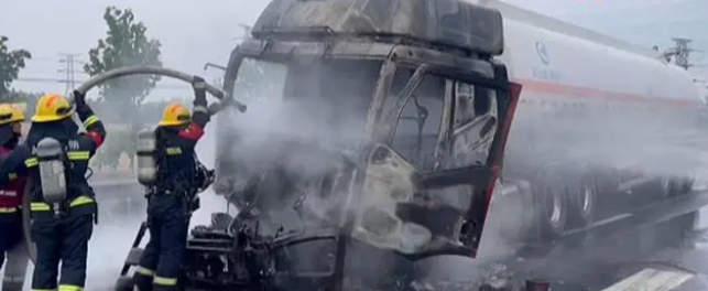 6月4日12時(shí)57分左右,江蘇淮安市消防指揮中心接到報(bào)警稱,位于淮安市洪澤區(qū)朱壩鎮(zhèn)往南京方向,;愤\(yùn)輸車追尾起火。 接到報(bào)警后,淮安消防支隊(duì)立即調(diào)派洪澤區(qū)大隊(duì)高良澗消防救援站3車14人趕赴現(xiàn)場(chǎng)處置。高良澗消防救援站到達(dá)現(xiàn)場(chǎng)后發(fā)現(xiàn),現(xiàn)場(chǎng)事故為;愤\(yùn)輸車追尾半掛車,;愤\(yùn)輸車車頭著火并冒出黑煙,駕駛?cè)藛T通過(guò)車載滅火器嘗試將火撲滅未果。 經(jīng)現(xiàn)場(chǎng)勘察了解,;愤\(yùn)輸車裝載的液體為汽油,被追尾半掛車裝載的是造紙材料,發(fā)現(xiàn)后車著火后時(shí)及時(shí)駛離現(xiàn)場(chǎng)。指揮員立即指揮,開展火災(zāi)撲救工作,一組出水槍,重點(diǎn)對(duì)著火的車頭部位進(jìn)行滅火;另外一組出水槍對(duì)后部槽罐進(jìn)行冷卻降溫,保障罐體安全。經(jīng)過(guò)緊張救援,成功將明火撲滅。 據(jù);奋囻{駛員介紹,他的車上裝有32噸多汽油芳烴,在信號(hào)燈處,他與前方等綠燈通行的半掛車有一段距離,覺(jué)得剎車可以剎住,剎車時(shí)發(fā)現(xiàn)剎車失靈,直接與前車追尾,車前冒黑煙,他下車拿滅火器發(fā)現(xiàn)撲滅不了。