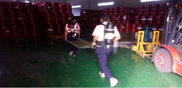 2、在應(yīng)急演練處置過程中,倉儲部作為應(yīng)急救援的主力軍,處置動作迅速、到位,對防毒面具的穿戴掌握熟練。