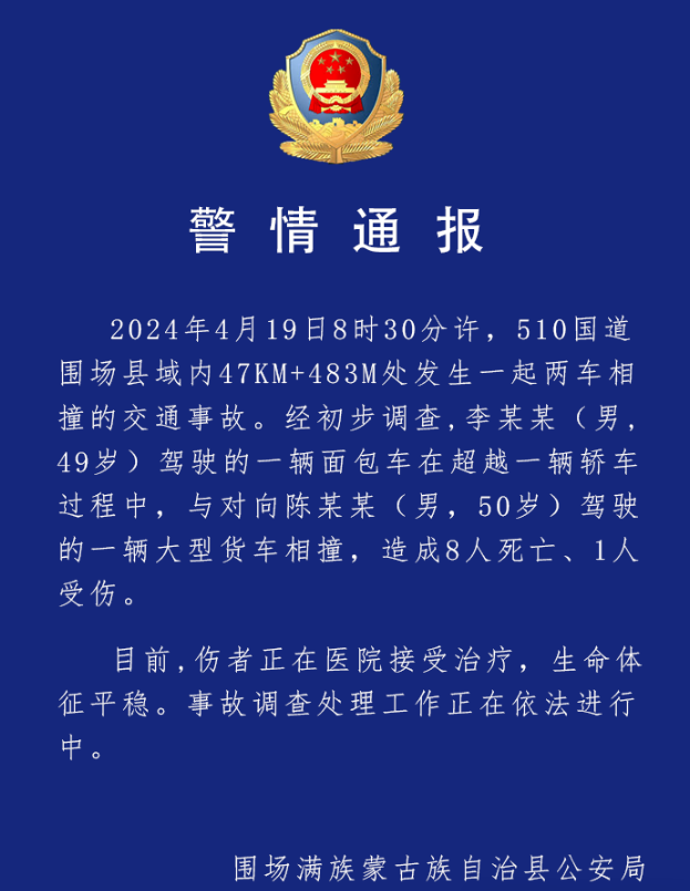 4月19日8時(shí)30分許,510國道圍場滿族蒙古族自治縣縣域內(nèi)47KM+483M 處發(fā)生一起兩車相撞的交通事故。經(jīng)初步調(diào)查,李某某(男,49歲)駕駛的一輛面包車在超越一輛轎車過程中,與對(duì)向陳某某(男,50歲)駕駛的一輛大型貨車相撞,造成8人死亡、1人受傷。目前,傷者正在醫(yī)院接受治療,生命體征平穩(wěn)。事故調(diào)查處理工作正在依法進(jìn)行中。