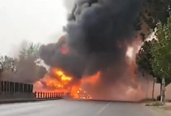 8日上午,記者從社交媒體平臺(tái)上看到,道路上黑煙滾滾,火光沖天,火勢(shì)出現(xiàn)蔓延,現(xiàn)場(chǎng)情形十分危急,附近還有路人遠(yuǎn)遠(yuǎn)圍觀不敢靠近。